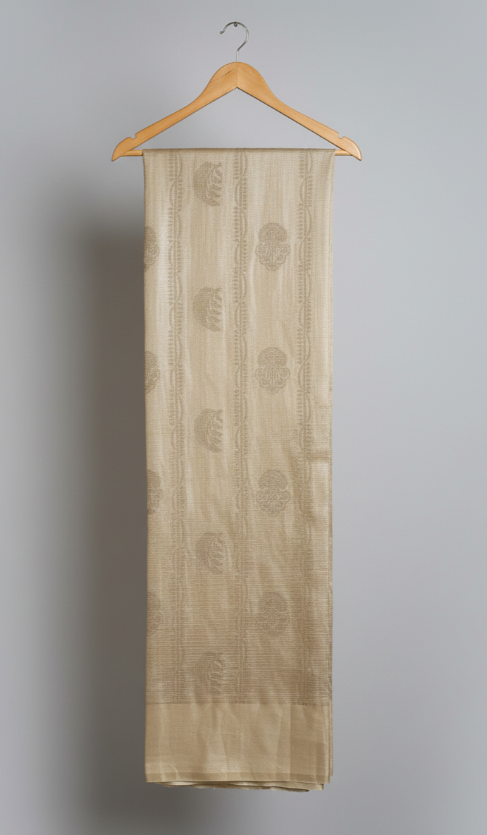 Elegant champagne-hued tissue Banarasi saree featuring delicate brocade patterns that exude timeless charm and understated richness.