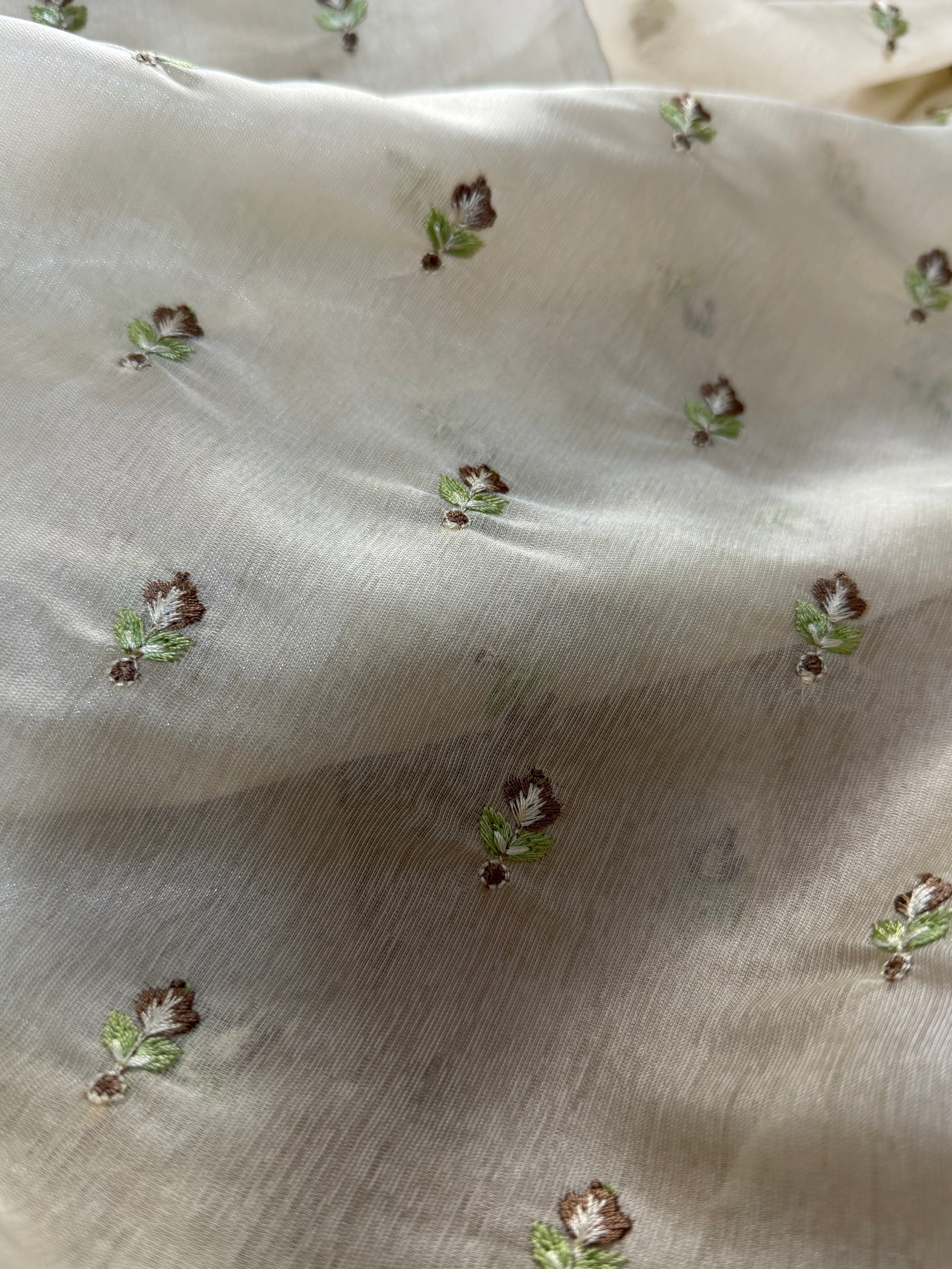 Our Golden Dewdrop Tissue Saree offers gentle elegance. This feather-light tissue saree, in a soft natural hue, features delicate embroidered motifs in olive green and earthy brown, resembling tiny leaves. It drapes beautifully and provides a refined, nature-inspired sparkle perfect for any occasion.