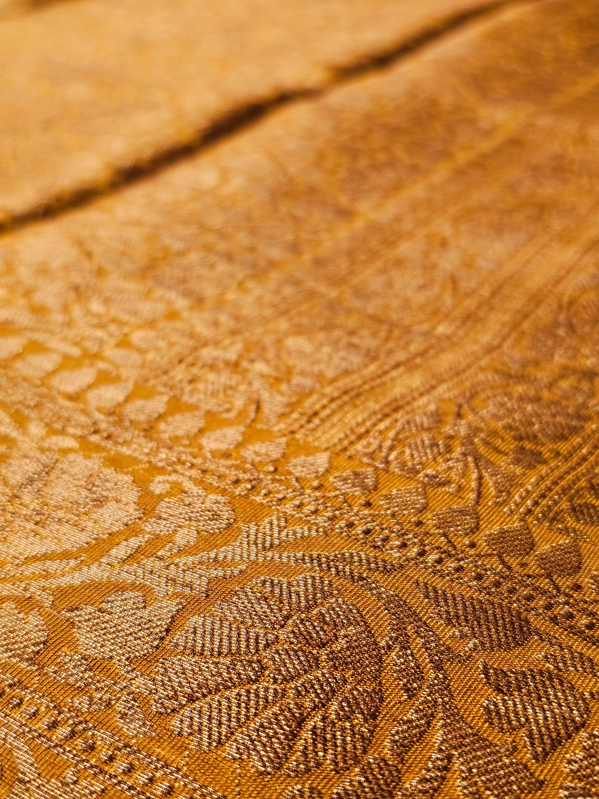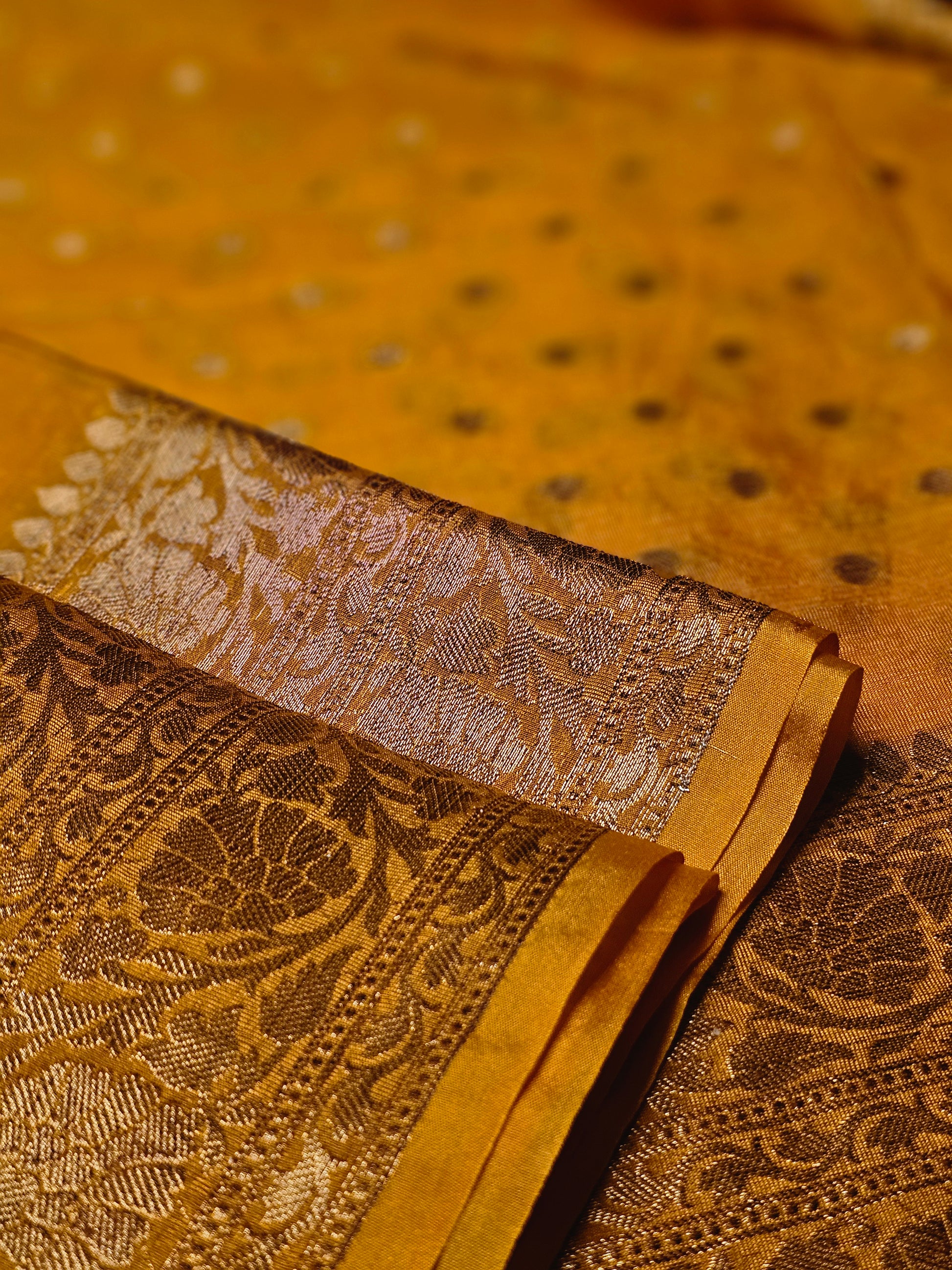 Draped in pure elegance, this Golden Hour Banarasi Chanderi Saree blends lightweight silk with the rich artistry of Banarasi weaving. The vibrant turmeric yellow body, adorned with subtle antique zari dots, flows into a lavishly detailed zari border, creating a perfect fusion of classic tradition and modern style.