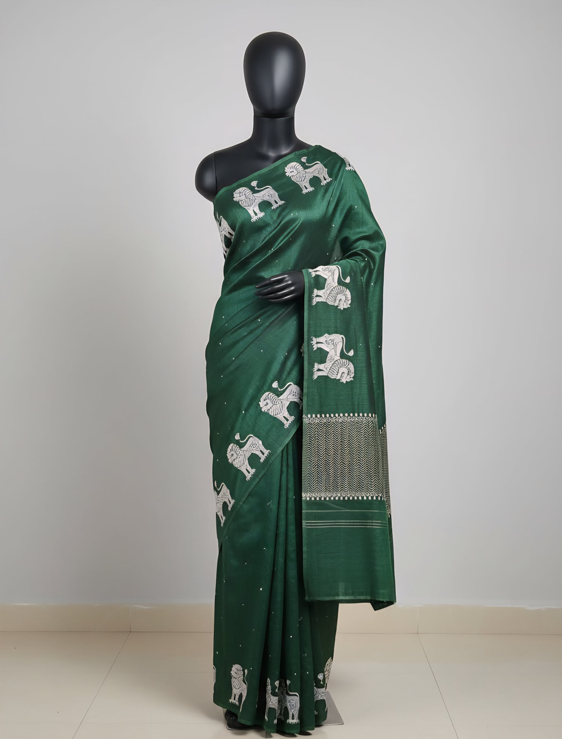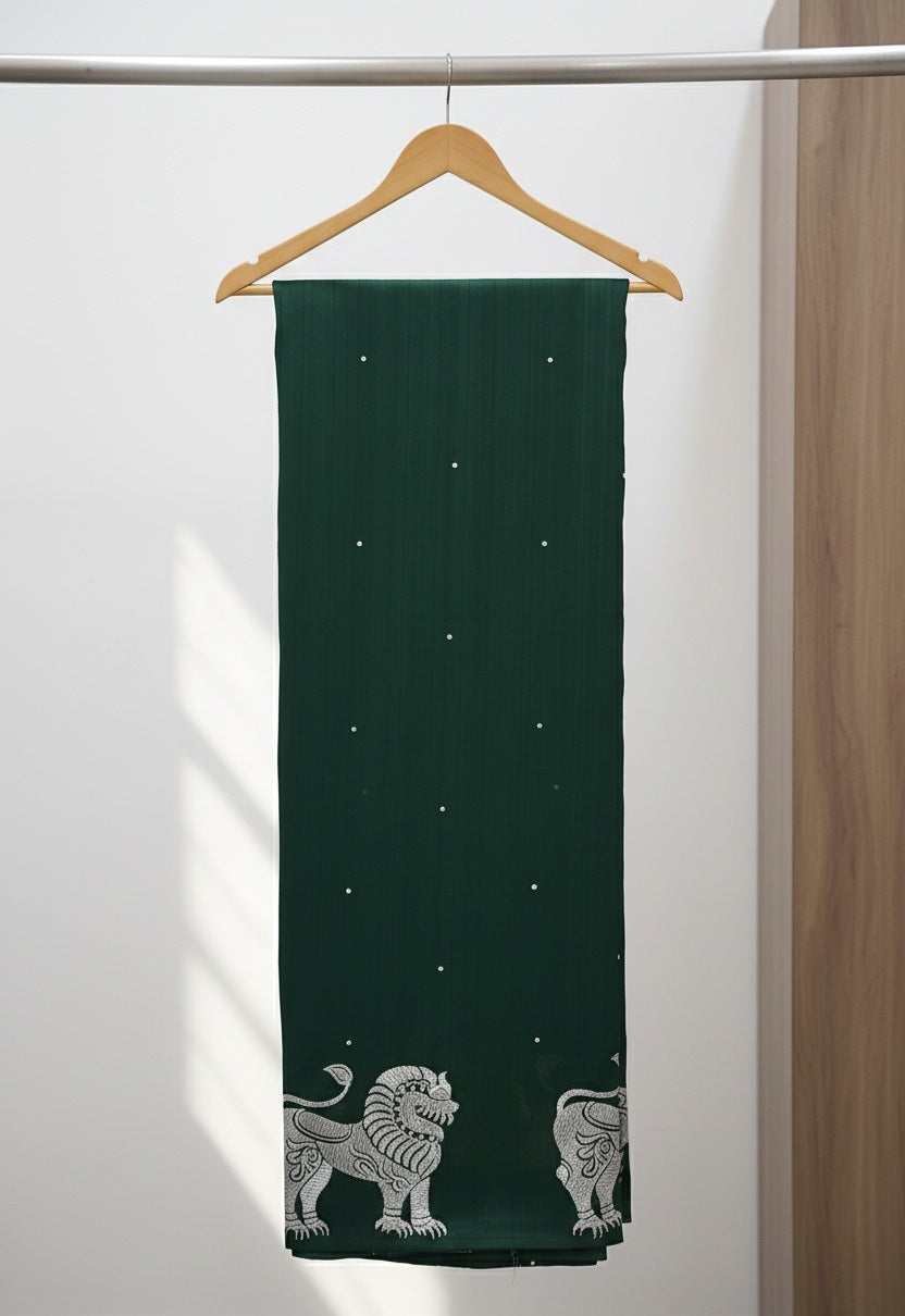 Embrace regal grace with the Madka Majestica saree. Woven from luxurious Madka silk in a deep emerald green, it's a canvas for breathtaking 'Sona Roopa' (gold and silver) lion motifs. These magnificent lions, symbolizing power and dignity, shimmer along the border, while delicate silver dots add a celestial sparkle. This isn't just a saree; it's a timeless statement of sophistication and strength.