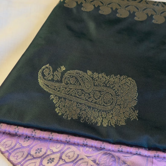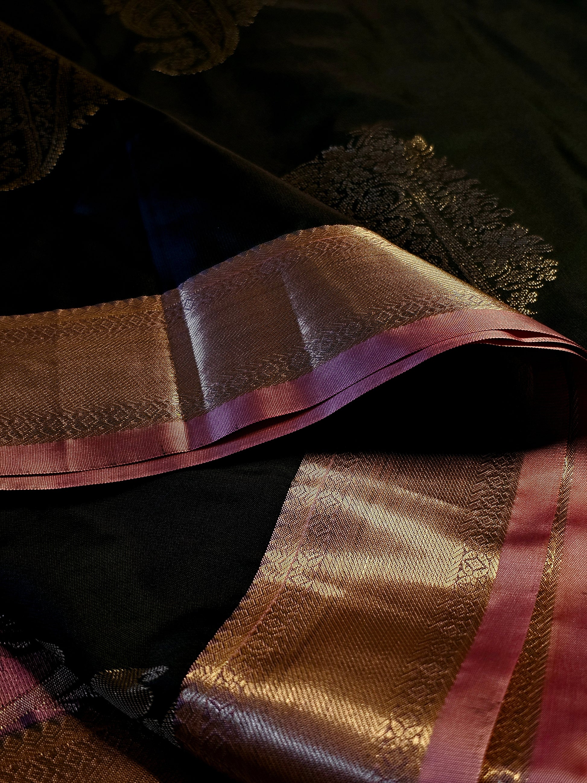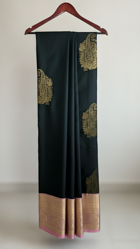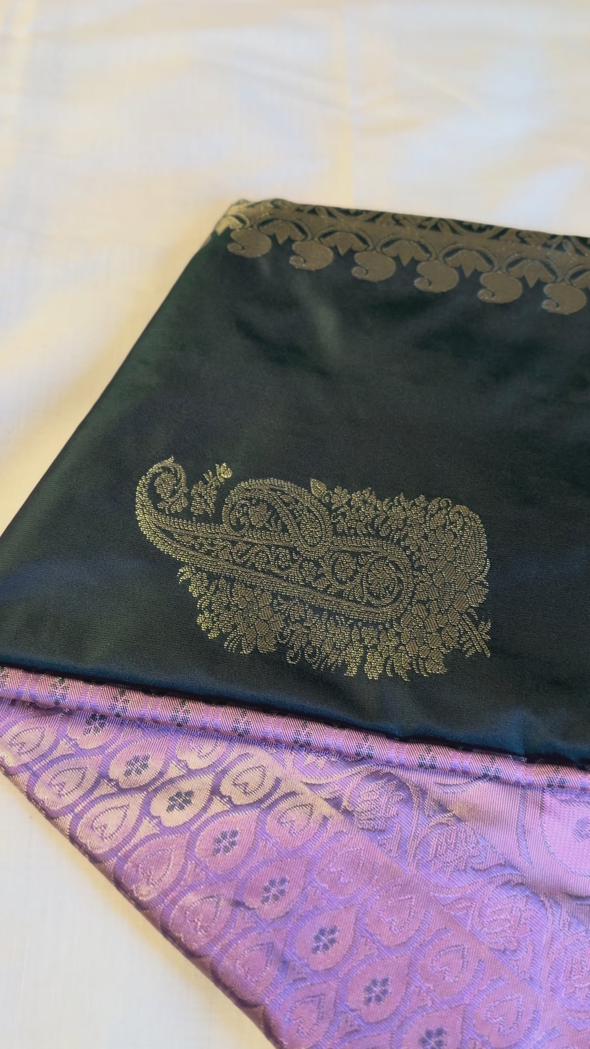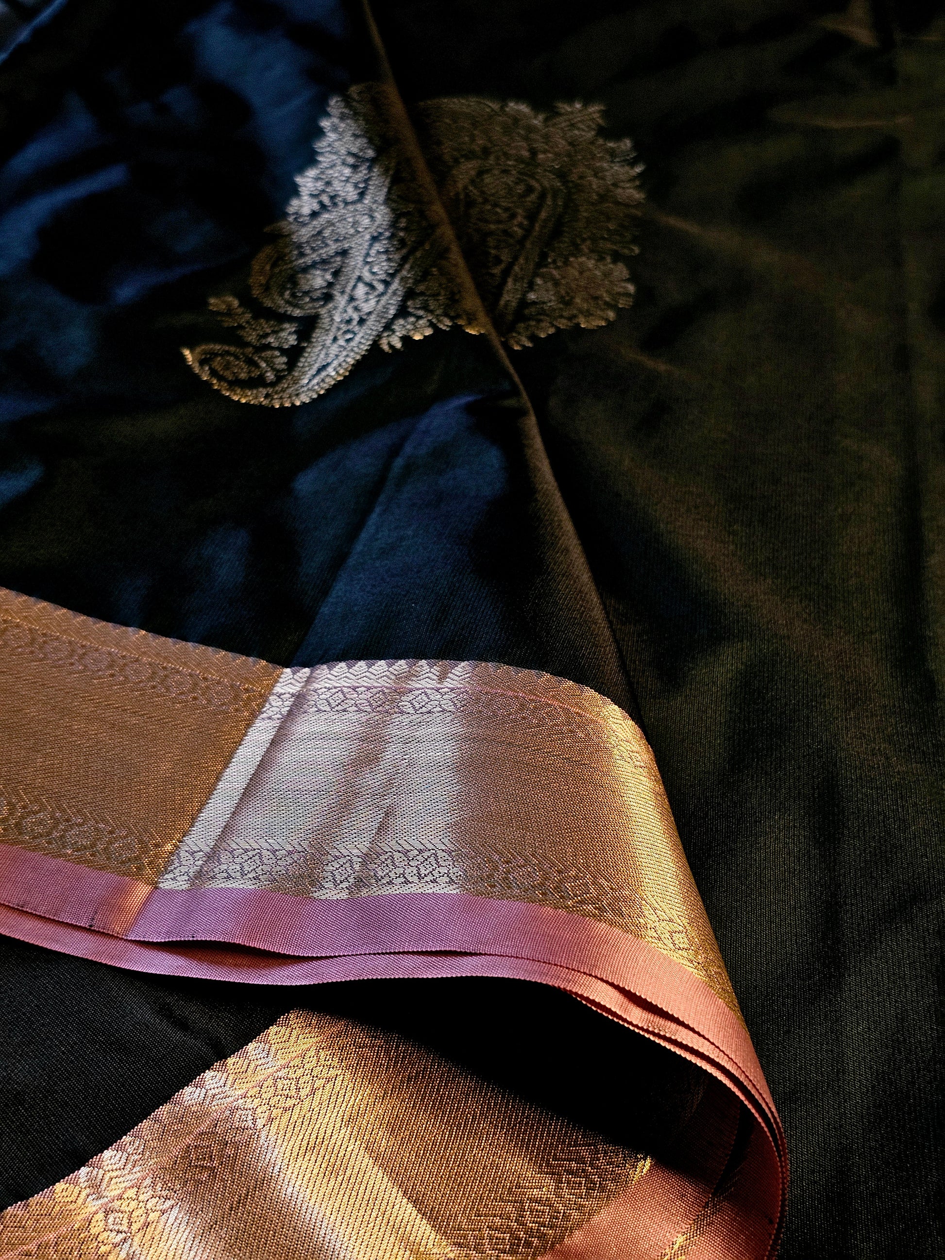 Draped in deep emerald green with two exquisite paisley motifs, this semi-Kanchi Pattu saree is the epitome of quiet luxury. The contrasting rich combination of gold and pink border add a majestic finish, making it perfect for both daytime celebrations and evening affairs.