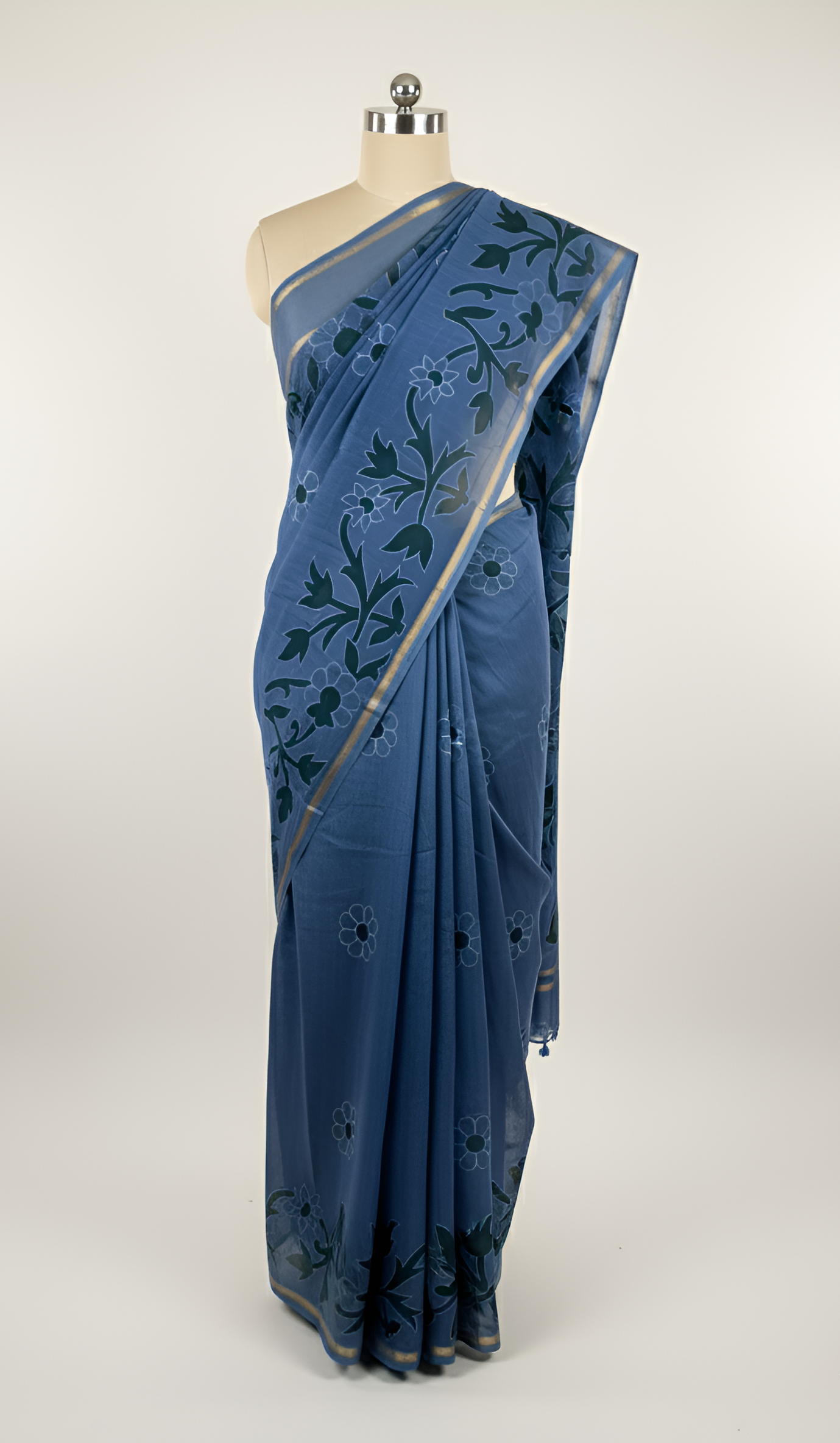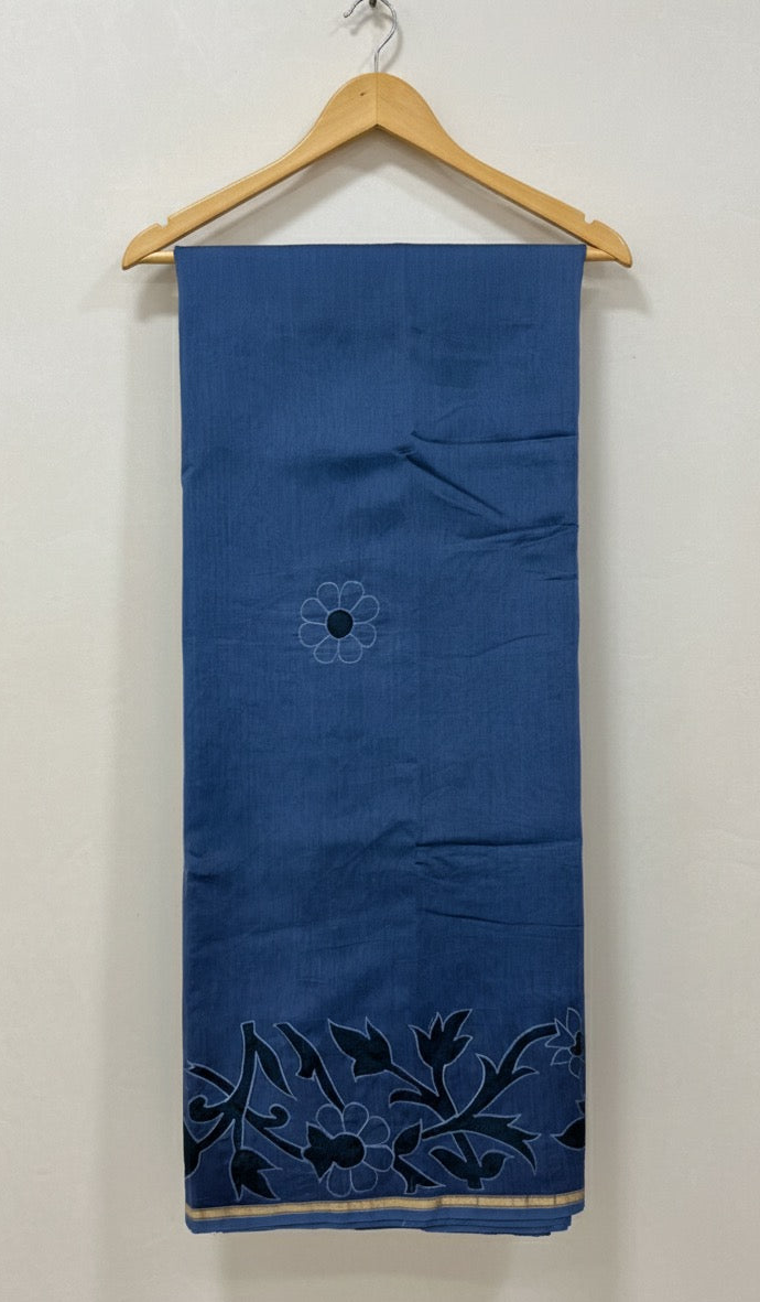 A serene Indigo Chanderi saree featuring exquisite, handcrafted floral appliqué motifs in deep emerald and lighter blue shades. A blend of traditional craft and timeless sophistication.